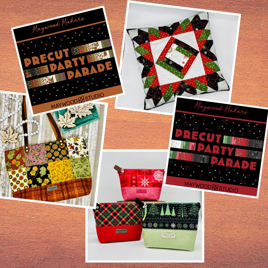 See all the Maywood Maker Quilts hereFor this Maywood Maker challenge, we worked with precuts that use the latest Maywood Studio fall and winter themed collections. I chose to use a charm pack of the Autumn Harvest Flannel Collection to create a tote, and a fat quarter bundle of the Christmas Night Collection to create a quilted pillow and zipper pouches.